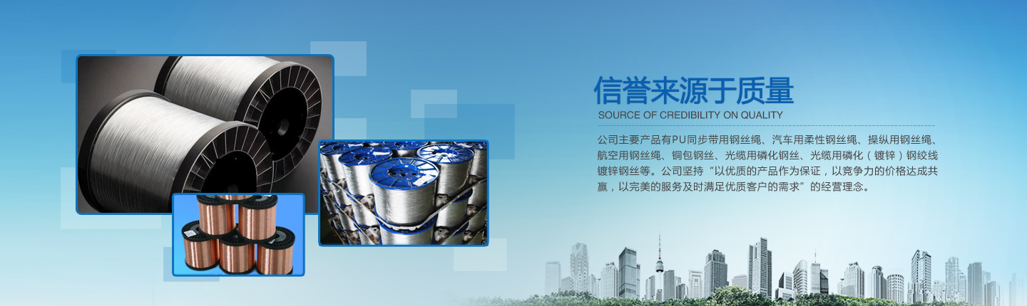 公司主要產(chǎn)品有PU同步帶用鋼絲繩、汽車(chē)用柔性鋼絲繩、操縱用鋼絲繩、航空用鋼絲繩、銅包鋼絲、光纜用磷化鋼絲、光纜用磷化(鍍鋅)鋼絞線、鍍鋅鋼絲等。經(jīng)過(guò)多年的研究、摸索、開(kāi)發(fā),公司已形成了完整的技術(shù)、工藝軟件,產(chǎn)品實(shí)物質(zhì)量均達(dá)到國(guó)際先進(jìn)水平。